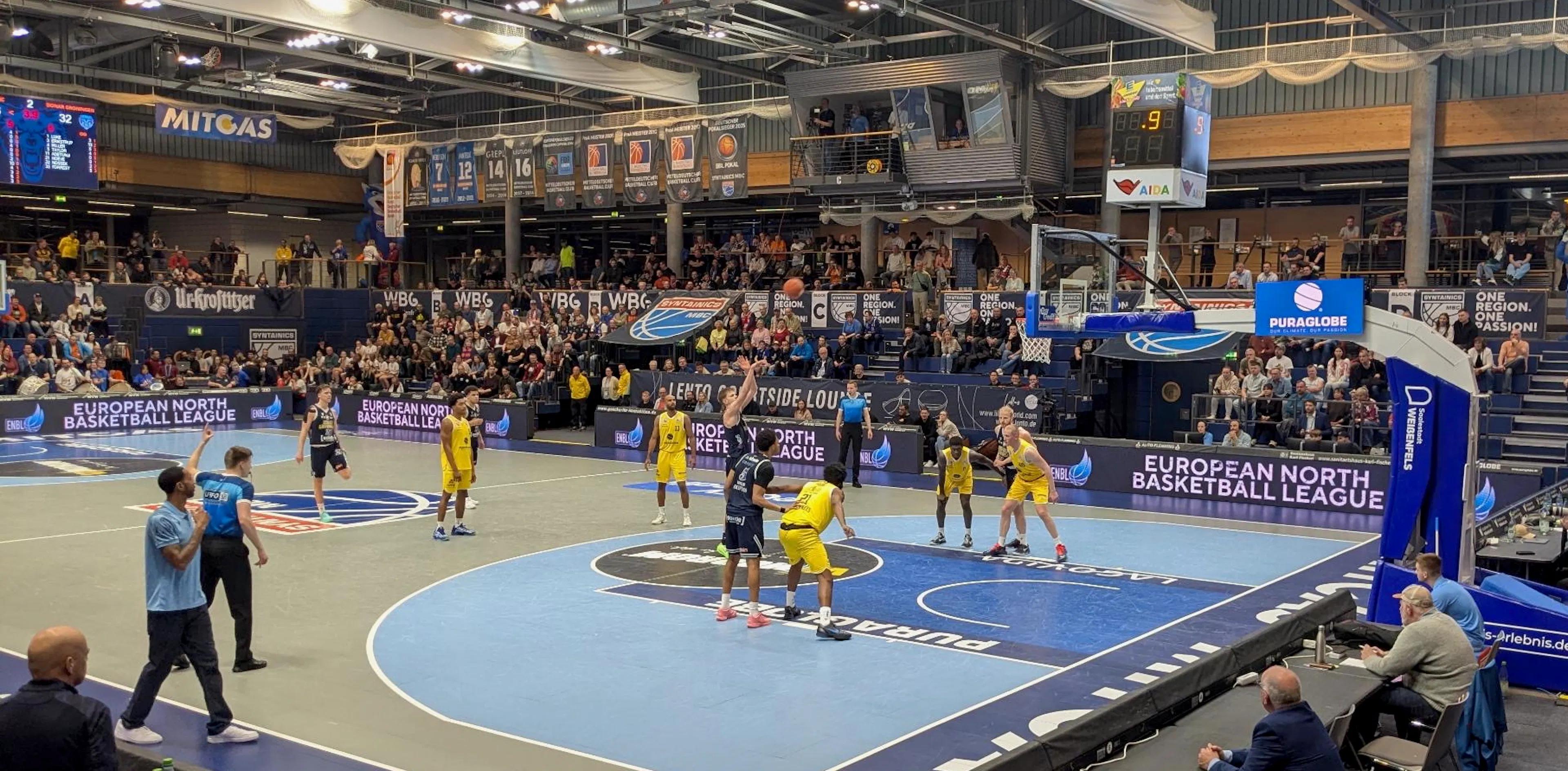 De Groninger fans die de wedstrijd vanavond via het Youtube-kanaal van de ENBL wilden volgen, moesten tot het eind van het eerste kwart geduld hebben voor er bewegende beelden doorkwamen. Technische problemen waren hiervan de oorzaak. Donar Groningen opent de score met een lay up van Dane Erikstrup, maar MBC Syntainics pakt het scoren over en komt snel op 8-2. Met een drietje van Malik Miller wordt het 8-5 halverwege het kwart. MBC loopt weer uit en het eerste kwart eindigt met een stand van 21-12.